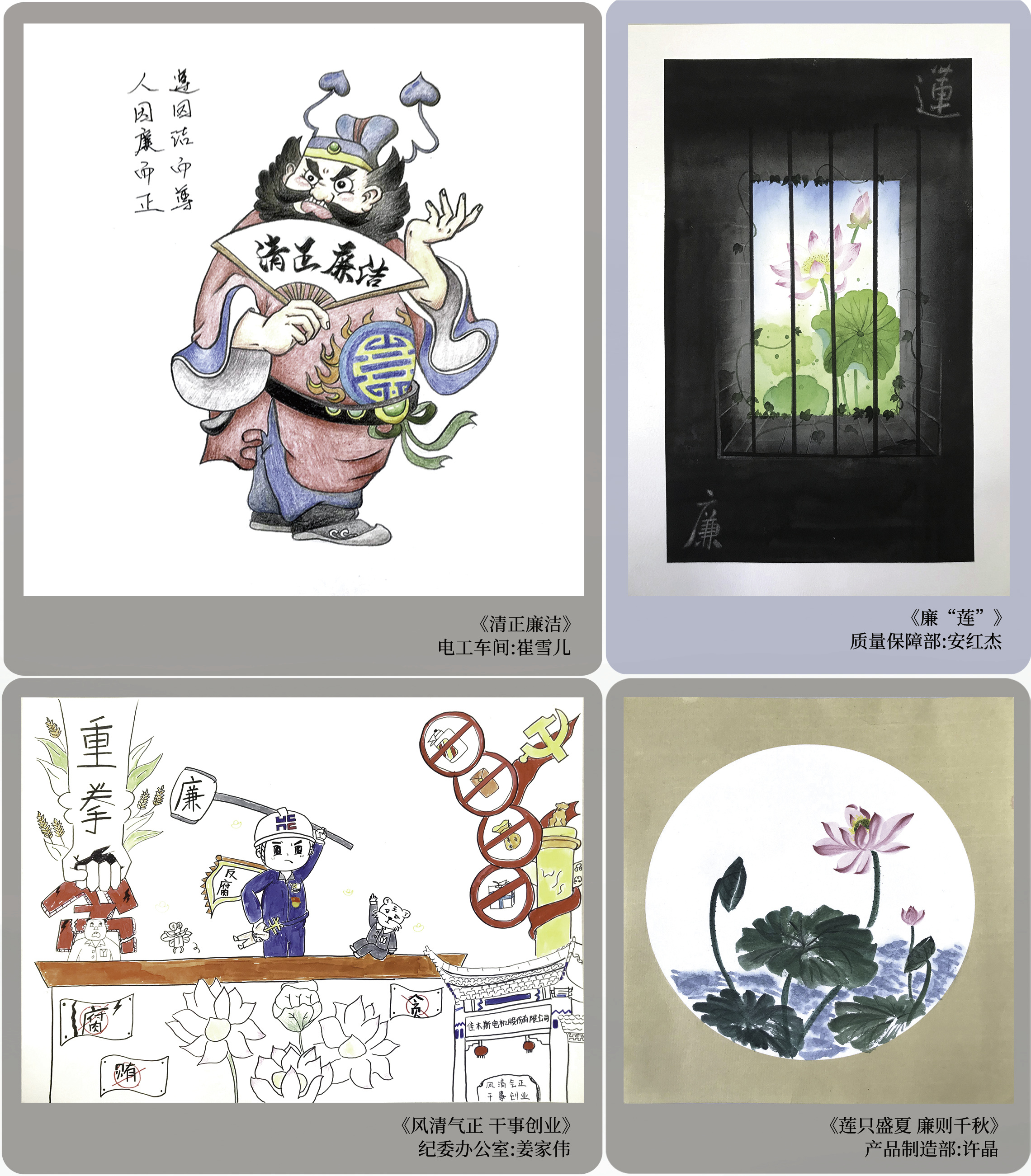 書畫言志,金石寄情。作品中既有以寓意廉潔高尚的“蓮”“竹”為元素的繪畫和幽默風(fēng)趣、構(gòu)思巧妙的漫畫,以廉政詩詞、格言警句為內(nèi)容的書法作品,也有驚艷奪目、精美細(xì)膩的五谷粘貼手工藝品,還有通過職工視角、別具一格的構(gòu)思,演繹拍攝出佳電廉潔文化故事。通過這些作品實(shí)現(xiàn)了廉潔文化與書畫藝術(shù)充分融合,增強(qiáng)了廉潔文化教育的吸引力、說服力、感染力和穿透力,展現(xiàn)了佳電股份廣大黨員干部職工防微杜漸、廉潔從業(yè)的信心和決心。