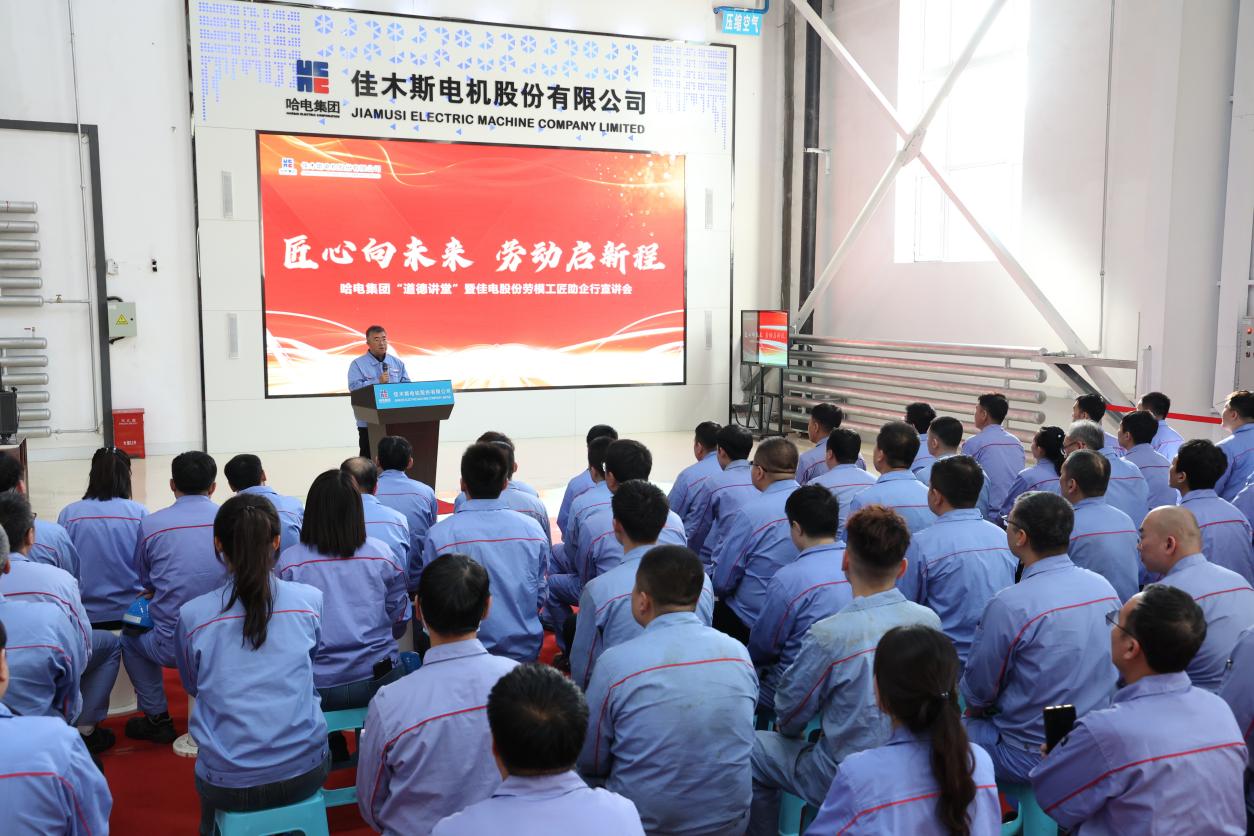 為深入貫徹落實(shí)習(xí)近平新時(shí)代中國(guó)特色社會(huì)主義思想,落實(shí)集團(tuán)公司“道德講堂”工作部署,圍繞公司“積跬步 成千里 向未來(lái)”工作安排,大力弘揚(yáng)“勞模精神、勞動(dòng)精神、工匠精神”,在公司范圍內(nèi)積極營(yíng)造“勞動(dòng)光榮、創(chuàng)造偉大”的時(shí)代新風(fēng)尚,5月24日,哈電集團(tuán)佳木斯電機(jī)股份有限公司(以下簡(jiǎn)稱“佳電股份”)在高壓電機(jī)數(shù)字化裝配車間,組織召開(kāi)首次“匠心向未來(lái),勞動(dòng)啟新程”為主題的哈電集團(tuán)“道德講堂”暨佳電股份勞模工匠助企行宣講會(huì)。佳電股份黨委副書(shū)記、工會(huì)主席劉亨出席會(huì)議并講話。