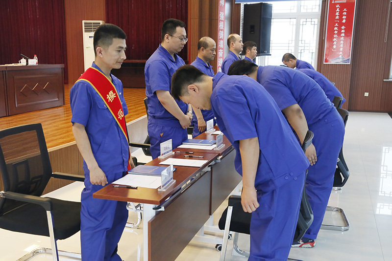 儀式上,結(jié)對(duì)師徒鄭重地在師徒協(xié)議上簽字,徒弟向師傅鞠躬行拜師禮,師傅向徒弟贈(zèng)送學(xué)習(xí)筆記本并寄語(yǔ)鼓勵(lì)。