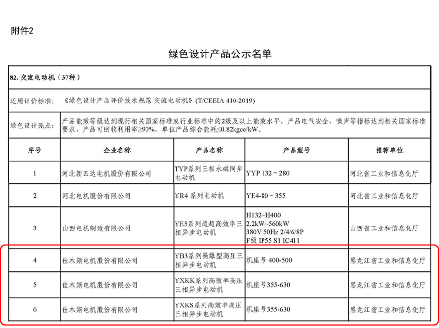 2021年12月, 3個系列高壓電機產(chǎn)品獲得國家“綠色設(shè)計產(chǎn)品”稱號,IE5系列電機機企業(yè)產(chǎn)品標準獲得國家企業(yè)標準“領(lǐng)跑者”稱號,該標準中規(guī)定的效率是目前國內(nèi)最高效節(jié)能隔爆型異步電動機產(chǎn)品,效率值超過最新的國家能效標準1級指標要求。受此認證,佳電股份將被納入萬家用能單位的采購?fù)扑]名單,作為綠色電動機產(chǎn)品被鼓勵優(yōu)先采購。